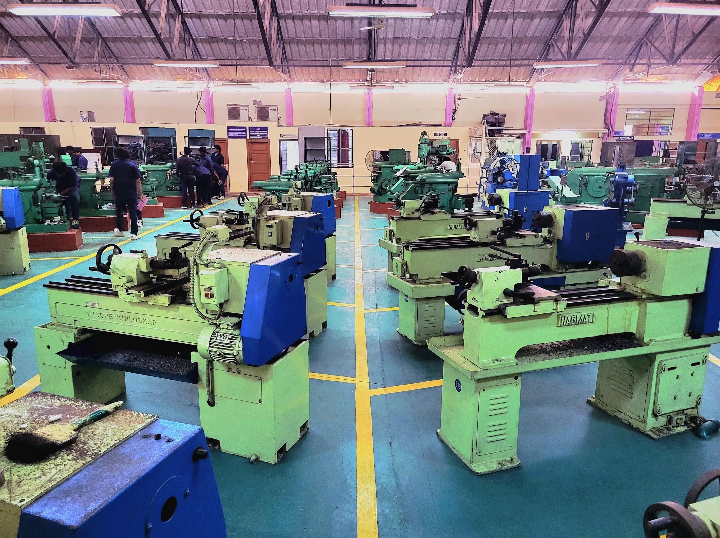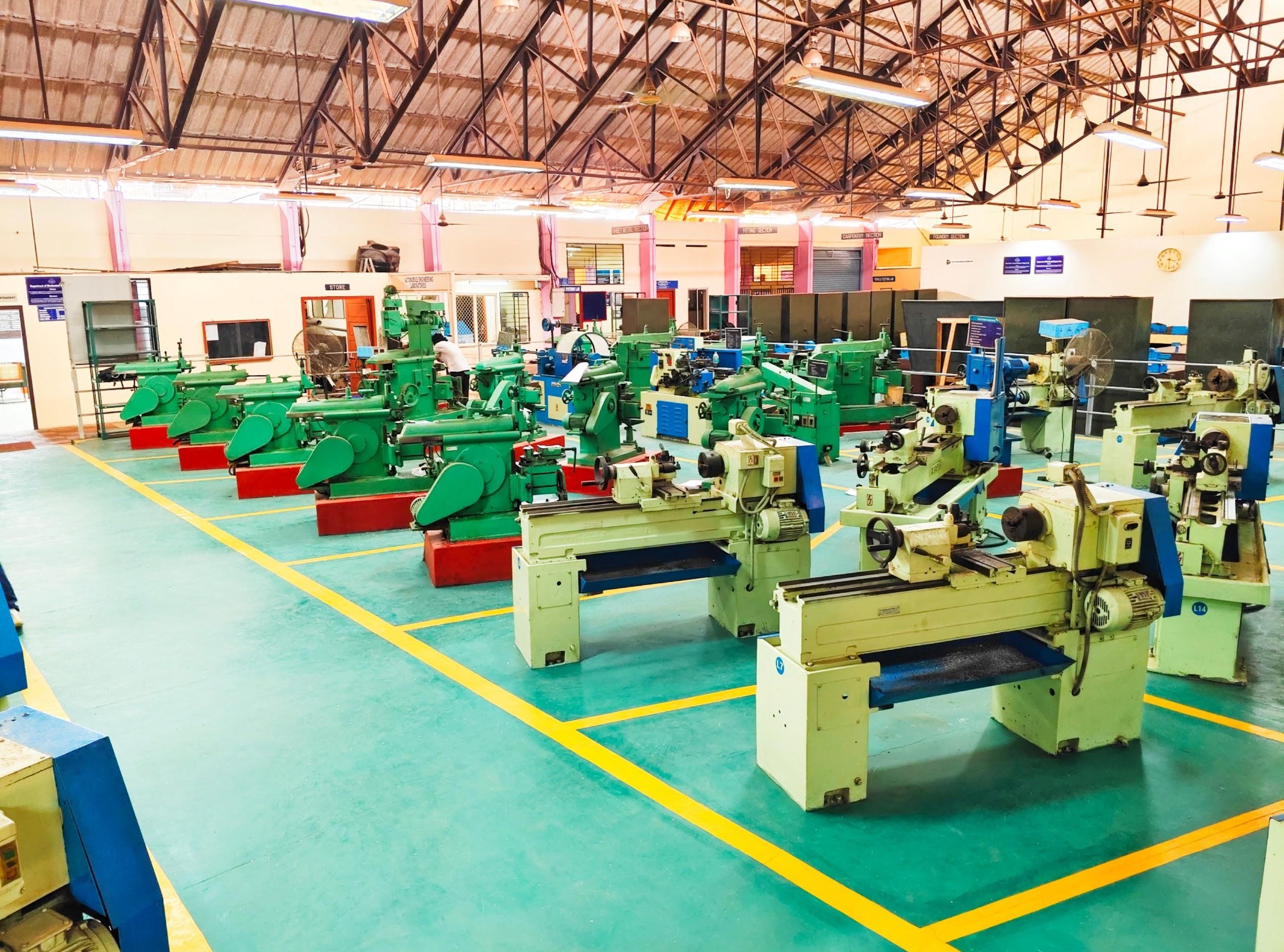 Introduced under the KTU 2019 scheme, this advanced lab covers mechatronics and modern automotive diagnostics. Students gain hands-on experience with electronic engine management systems using equipment such as chassis dynamometer, Euro VI-compliant universal ECU scan tool, computerized wheel alignment machine, wheel balancer, portable five-gas exhaust analyzer, brake tester, auto electrical testing tools, electronic injector test bench, headlight aligner, decibel meter, Orsat apparatus, FIP calibration machine, and more. Additional fabrication machines support project work and final-year assignments.