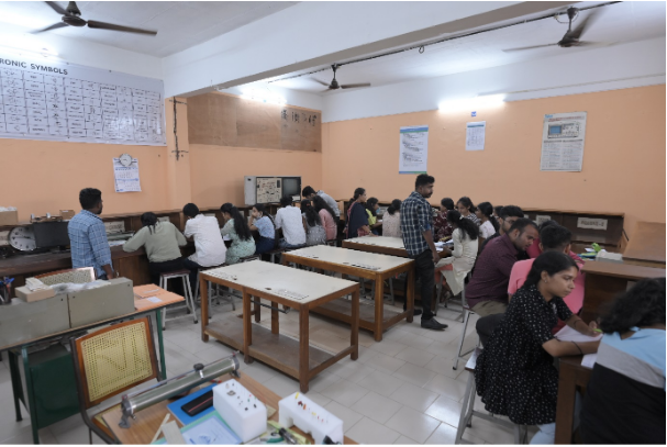 This lab is fully equipped to give sufficient exposure to students on the fundamental concepts of electronics. This lab enables the student to acquire practical skills on electronic circuit wiring and gives the student a basic awareness of safety measures. This subject also imparts fundamental knowledge of electronic components and familiarizes the students with setting up circuits by soldering and testing them.